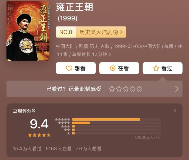 以前的金鹰奖和飞天奖,《雍正王朝》凭一己之力就获得14个奖项,是中国剧史上获奖最多的电视剧,莫得之一。