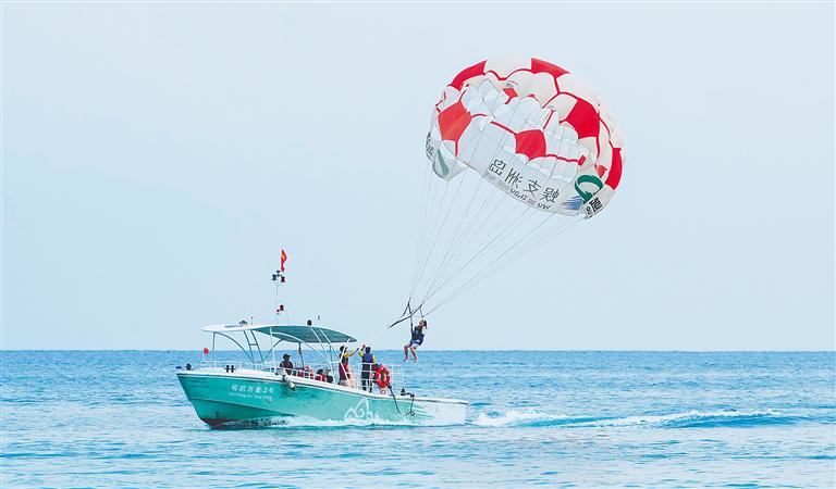 5月1日,搭客在三亚市大东海旅游区体验水上景况。海南日报全媒体记者 王程龙 摄