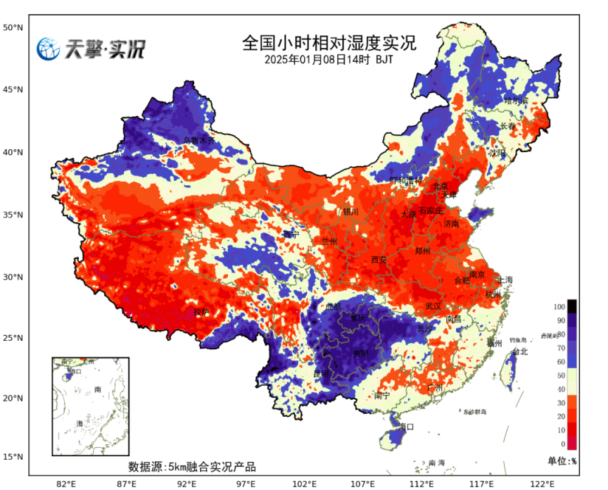 ↑ 今天下昼相对湿度实况图看,南边不少方位依旧是相比干燥的。