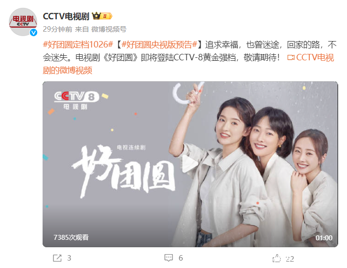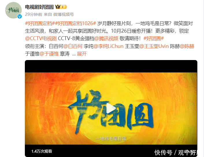 10月26日,也便是翌日,36集现实主义题材剧集《好团圆》,就将登陆央视八套的黄金档。