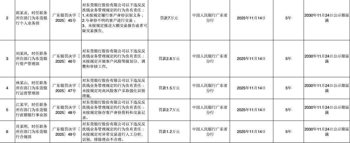 同期,中国东谈主民银行广东省分行对东莞银行5名关联部门连累东谈主分别处罚1.2万元~7万元不等,系数处罚金额15.2万元。