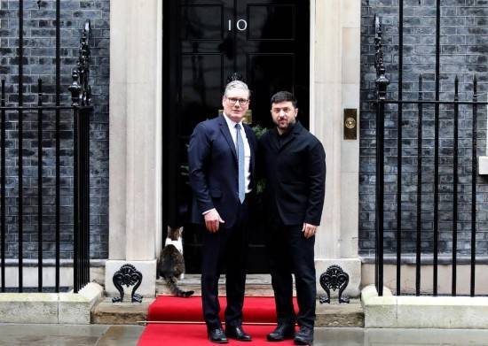 12月8日,在英国伦敦唐宁街10号首相府前,英国首相斯塔默(左)与乌克兰总统泽连斯基合影。新华社记者李颖摄