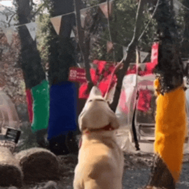 一拉布拉多看到主东谈主的小鳄鱼玩物挂在树上了,就思着维护拿下来。