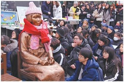 韩国大家在皆门首尔一处象征日军“慰安妇”受害者的“和平仙女”雕像周围举行抗议行动。本报记者 陈尚文摄