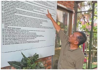 马来西亚槟城战役博物馆创建者佐哈里在展板前先容日军占领槟城后发布的“38项严令”。本报记者 白元琪摄