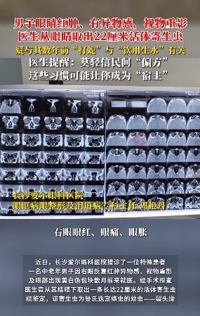 近日,长沙爱尔眼科病院接诊了一位独特患者——又名中老年须眉因右眼反复红肿异物感、视物重影及眼部出现黄白色包块数月前来就医。经手术探查,大夫竟从其结膜下取出一条长达22厘米的活体寄生虫!经轻松,该寄生虫为曼氏迭宫绦虫的幼虫——裂头蚴。